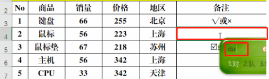 1、选中目标单元格,在拼音输入状态(推荐搜狗)键盘输入拼音【dui】或【cuo】,一般在第5个就会出现√或×,直接选中录入即可。只需要输入一次即可,再用直接调用剪贴板复制粘贴即可。
