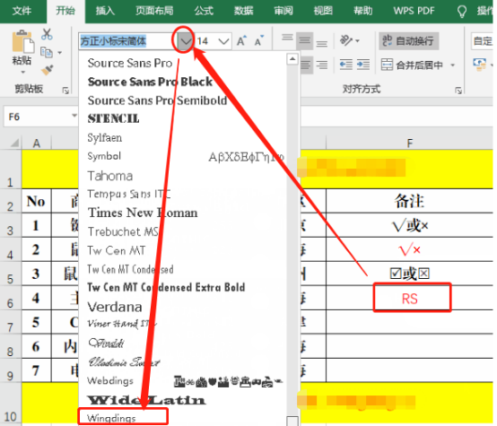 3、然后将单元格中的字体更改为【Wingdings 2】(一般在最下方)。