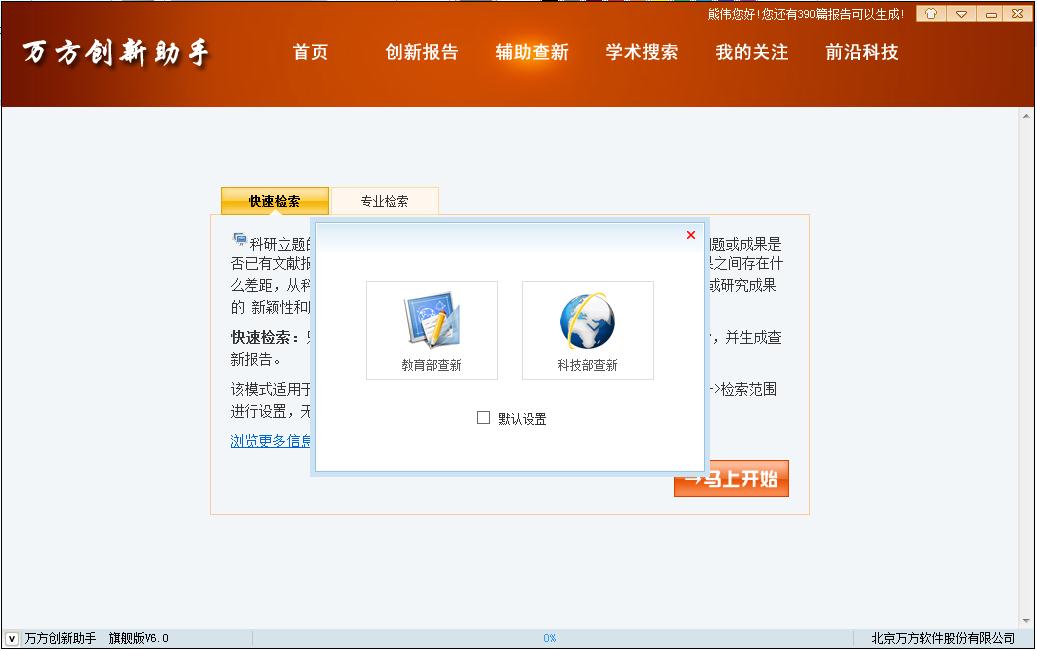 点击【马上开始】,弹出教育部查新和科技部查新模板,勾选【默认设置】后,后边弹出固定模板。