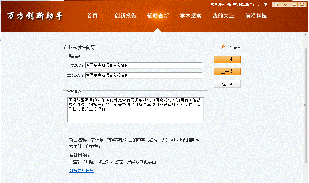 按照专业查新流程,填写查新项目名称、查新目的、查新技术要点,以及填写检索策略,对检索结果进行筛选,并可以将不同检索策略的多次检索结果合并,最终生成查新报告。 该模式适用于专业查新人员完成正式查新工作,输出报告格式为Office Word。填写项目名称及查新目的: