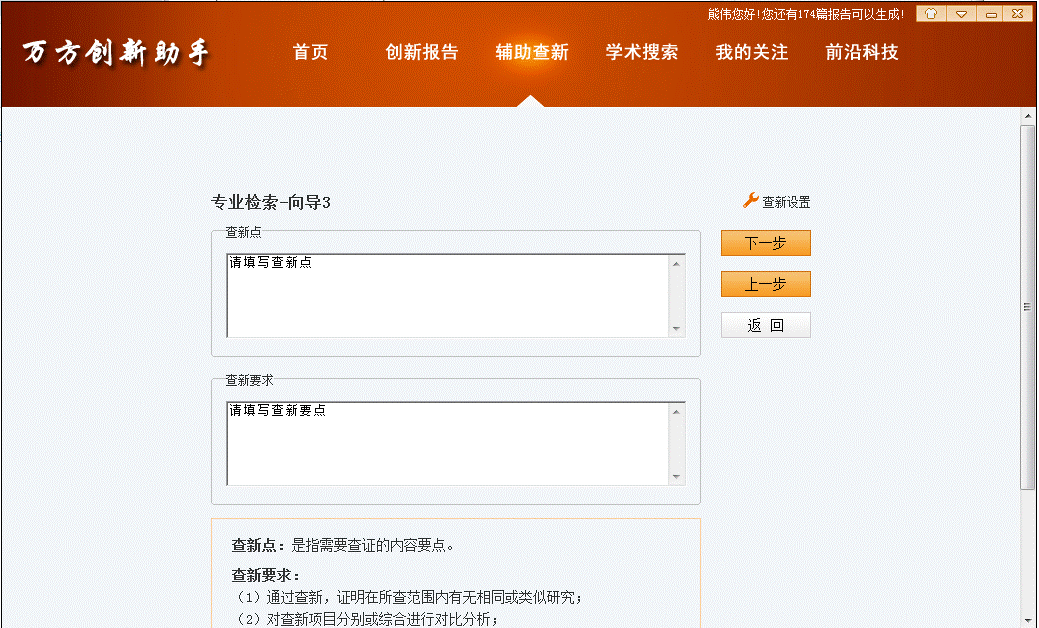填写查新点和查新要求:
