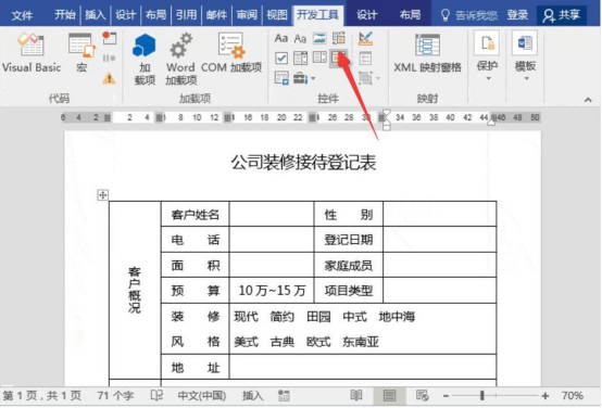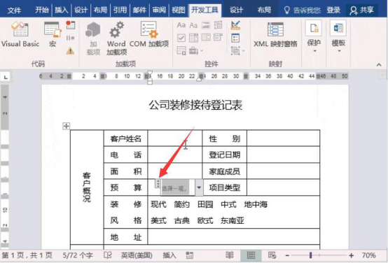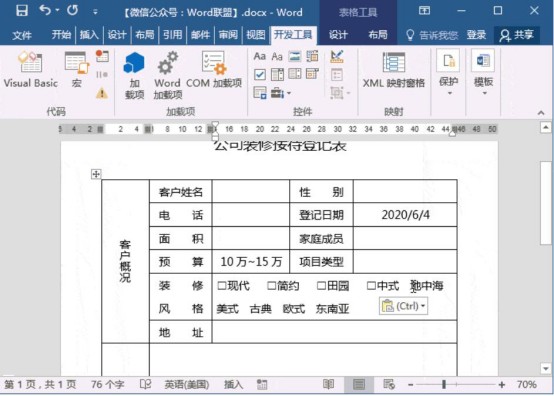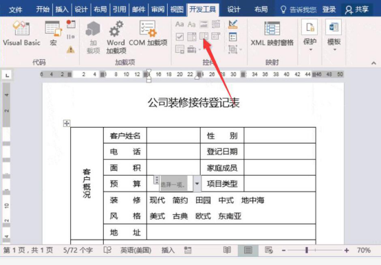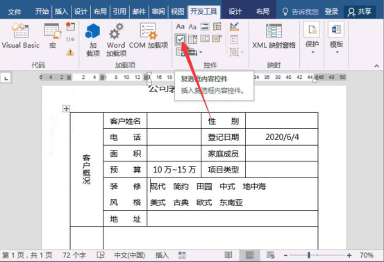 9.此时,在word文档中便可以看到具体的登记日期了。接着,在装修风格的右侧单元格中,我们看到有很多不同的风格,需要在各风格前添加复选框。就点击word文档“开发工具”中的“复选框内容控件”。