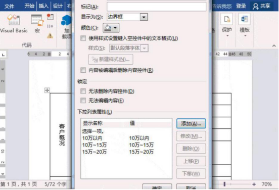 4.点击word文档的下拉列表内容控件的属性,从而设置该下拉列表的具体内容。