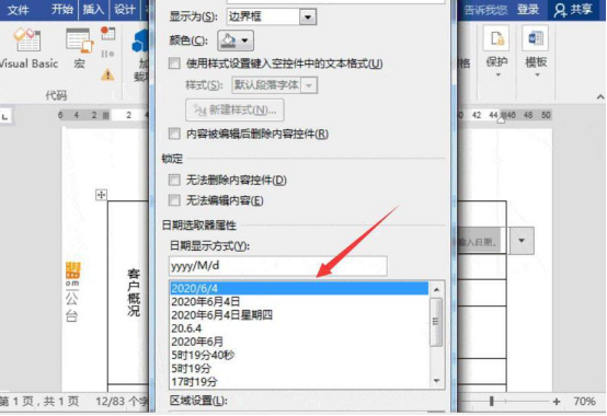 7.点击word文档中的日期控件左上方的属性按钮,设置日期显示方式。