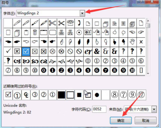 12.此时便会弹出“符号”窗口,选择“Wingdings 2”字体,点选“☑”,再点击“确定”按钮,即可将该复选框的样式应用到word文档的各种装修风格的前面。