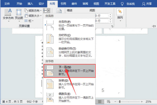 2.先将光标定位到第4页的末尾,点击word“布局”菜单中的“页面设置”,从页面设置中的功能项中点击“分隔符”,并从分隔符的下拉菜单中点击“下一页”。