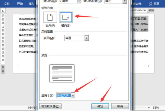 9.最后,在页面设置中,点选“横向”,并选择应用于“所选文字”,再点击“确定”按钮。这样一来,word便同时拥有了纵向和横向的布局。