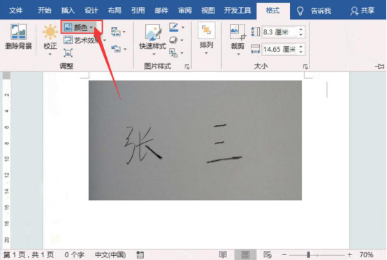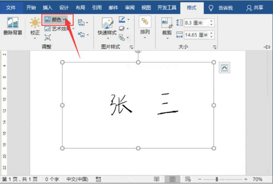 2.然后,将拍好的手写签名照,通过word的“插入”菜单将它插入到word文档中。再点击“格式”菜单中的“颜色”,在颜色菜单中选择“黑白”效果。