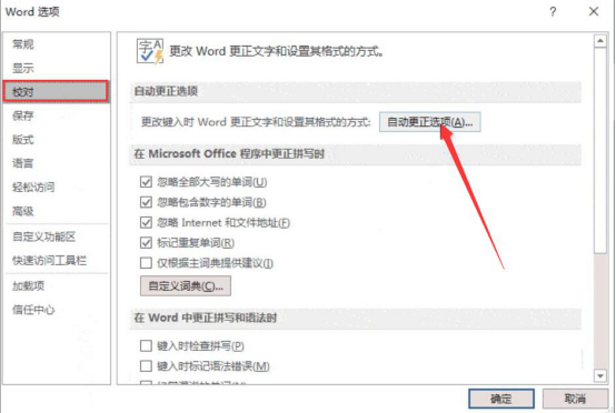 6.随后,我们单击该手写签名照,点击word的“文件”菜单进入word选项,点击“校对”,右侧界面中点击“自动更正选项”按钮。