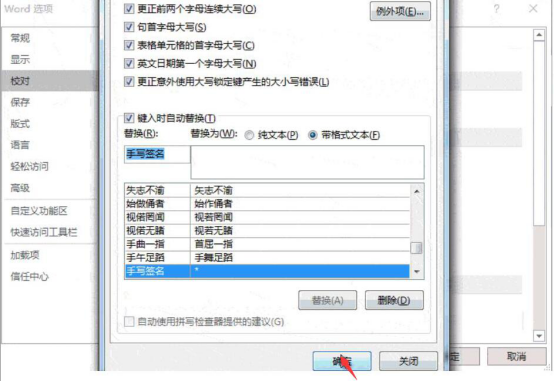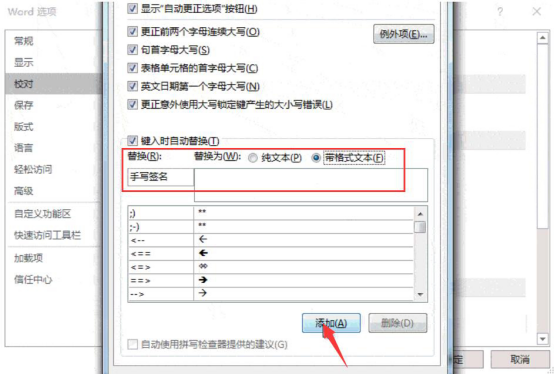 7.此时,word会弹出如下图的自动更正窗口。在此窗口中的替换处,手写输入一个快捷短语,例如,这里编辑为“手写签名”,再勾选“带格式文本”,之后,点击“添加”按钮。