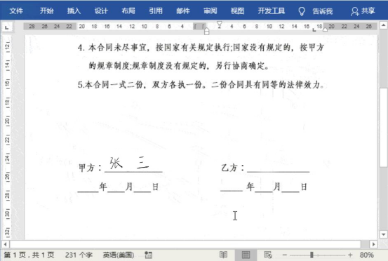 9.最后,我们打开一个需要我们使用电子版手写签名的word合同文档。将光标定位到甲方的下划线上,然后输入“手写签名”这个快捷短语,就能立刻自动生成我们以上制作的电子版手写签名,只需要调整它的大小和位置就可以了。