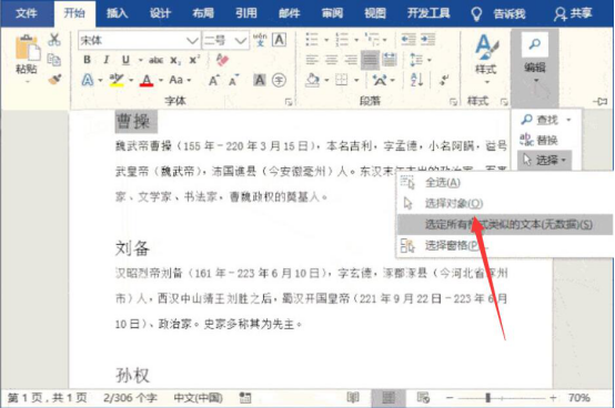为了修改word文档的所有标题格式,很多人是一个个标题依次选择。其实,大可不必这样,我们可以高效编辑,先选中word的某一个标题,再点击“开始”菜单中的“编辑”,从中点击“选定所有格式类似的文本”即可快速选中相同格式的标题了。