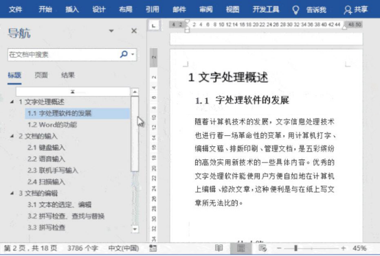 此时,word便会在左侧弹出导航的界面,当鼠标点击某个标题的时候,右侧界面便会同时展示出该章节的内容,方便我们更高效编辑word。