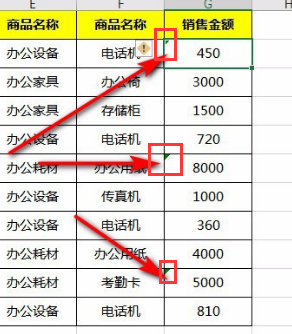 4.回到表格,我们发现,每个销售金额的格子左上角都会有个绿色小三角,这个小三角其实就说明,这个是文本型数值