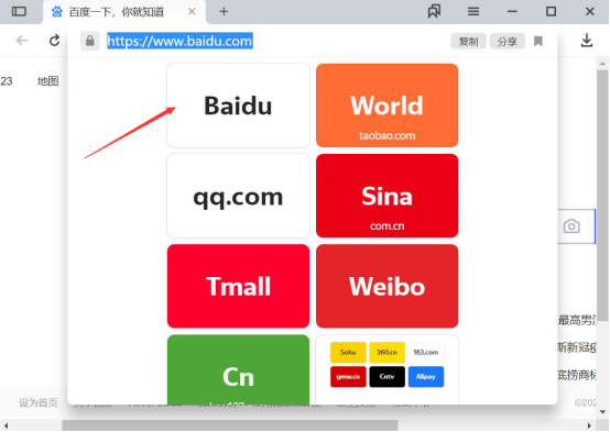 2.然后,我们用鼠标单击YandexBrowser的地址栏,它便会弹出如下图的热门网站。比如说点击“Baidu”即可快速访问百度网站。