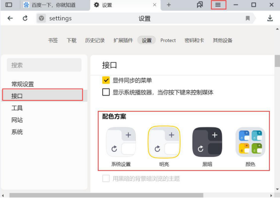 3.接下来,点击YandexBrowser浏览器右上方的“≡”,进入YandexBrowser的设置界面。如果想要更换YandexBrowser界面的主题颜色,就点击左侧的“接口”,在右侧的配色方案中,点击自己想要的主题即可应用。
