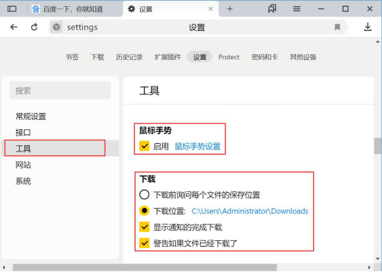 4.此外,我们在YandexBrowser的“工具”中,可以启用鼠标手势和设置YandexBrowser下载文件时的保存位置和消息通知。