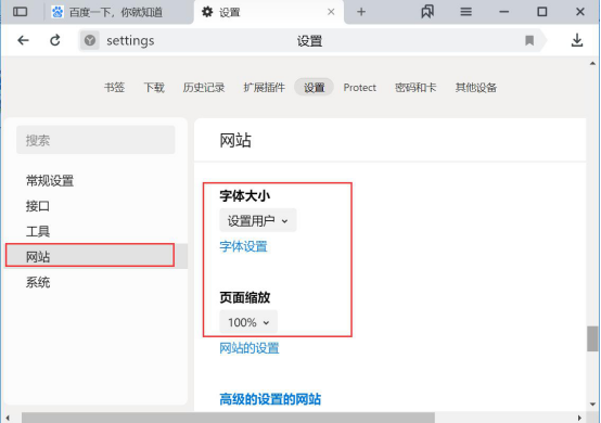 5.如果YandexBrowser的浏览器的字体大小和缩放比例不符合自己的需要,也可以在YandexBrowser的“网站”中进行设置,如下图。