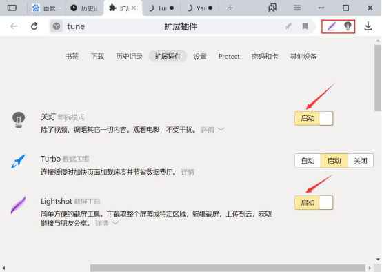 7.最后,在YandexBrowser中,我们还可以添加扩展插件方便自己日常使用。点击浏览器右上方的“≡”,从中点击“扩展插件”。在扩展插件页面中,比如要添加“关灯”和“Lightshot”插件,就分别点击启动。这两插件便会自动添加到YandexBrowser的扩展栏。
