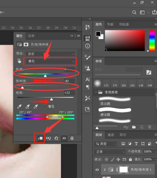 3、调出色相/饱和度的属性面板,参考如图选择“黄色”,降低饱和度,增加明度,并点击属性面板下方的第一个按钮,只对图层1有效,如图