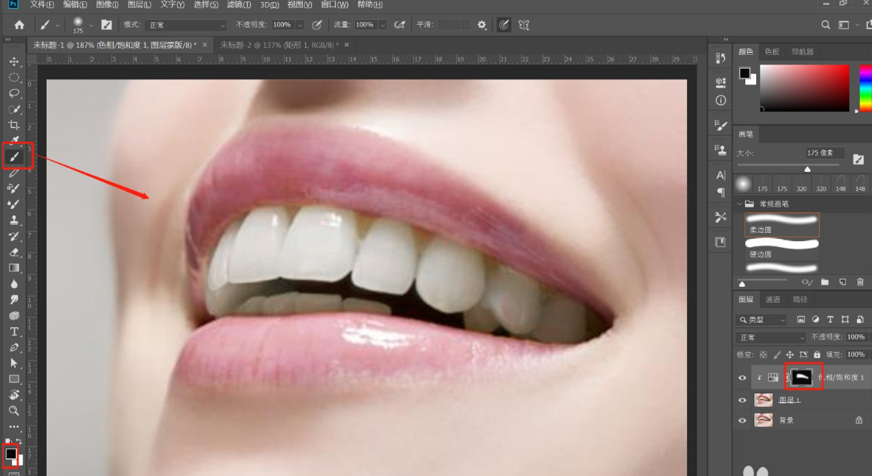 4、刚才提亮牙齿时,也将周围的皮肤提亮了,点击此图层的蒙版,前景色选为黑色,使用柔边圆画笔,在牙齿周围的皮肤涂抹,恢复之前的肤色,效果如图