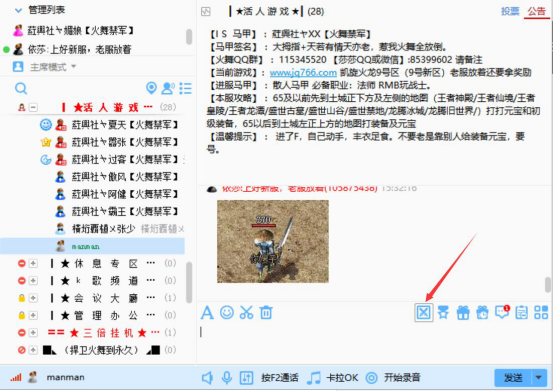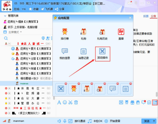 3.再点击聊天窗口工具栏中的“活动插件”功能按钮,从而进入IS游戏语音活动插件的操作页面。