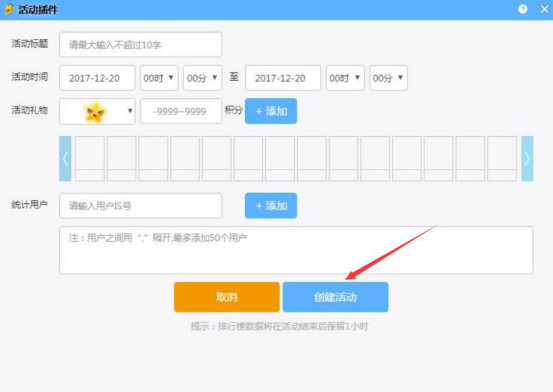 5.此时,IS游戏语音便会弹出活动插件的设置页面。用户根据自己的需要,设置活动标题、时间、礼物、统计用户数,再点击“创建活动”按钮。