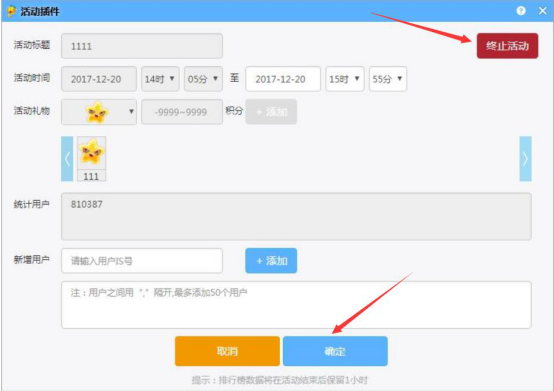8.弹出IS游戏语音活动插件窗口,重新设置活动时间和参与用户,点击“确定”按钮。而如果需要立即结束活动的话,就点击右上方的“终止活动”红色按钮。