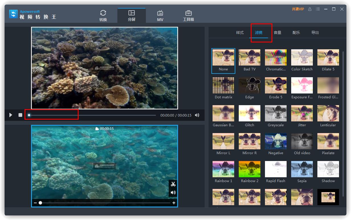 2、如果你想添加视频滤镜,可以在右方选项中点击【滤镜】,Apowersoft视频转换王提供了三十种滤镜,大家随意选择,选好之后,拖动视频播放条可以查看具体效果,