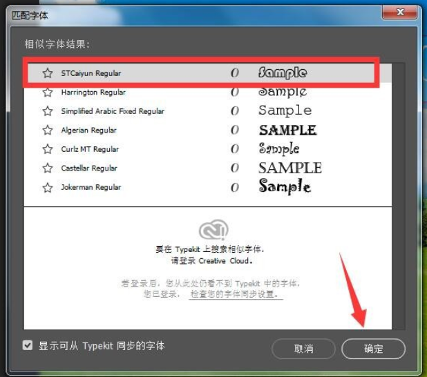 此时会显示查找到的匹配字体,点击确定,同时,你还可以借助文字工具在图片中输入想要替换的文字,