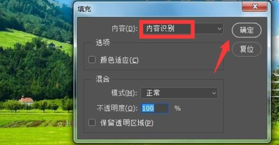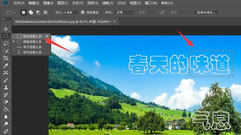 在左侧工具栏中点击【矩形选框工具】,选择需要清除的文字,进行内容识别消除操作,