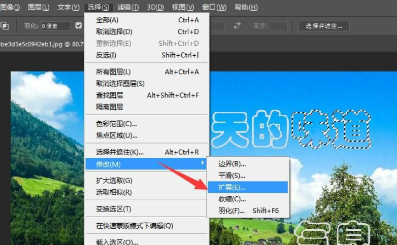 然后在菜单栏点击【选择】——【修改】——【扩展】,弹出扩展选区窗口,设置【扩展量】为2,点击确定按钮。