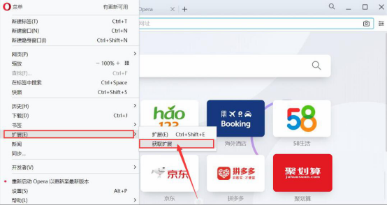 2.然后,点击Opera浏览器的左上方浏览器图标,在菜单列表中点击“扩展”中的“获取扩展”。