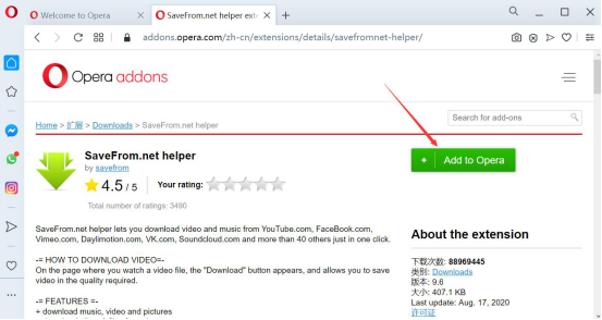 4.接下来,在该插件的页面中,点击“+Add to Opera”按钮,Opera浏览器便开始下载安装该插件。