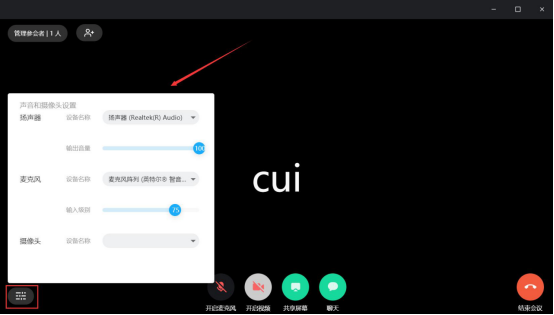 6.当我们点击有道云会议左下方的折叠按钮,在其弹窗中便可以根据自己需要来设置声音和摄像头。