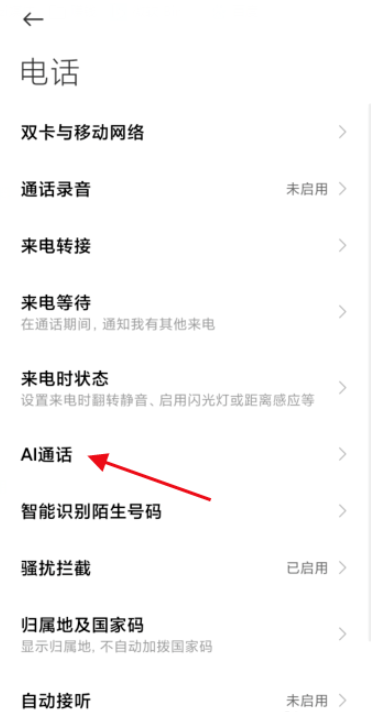 AI通话功能入口集成在电话设置中,打开手机,点击电话——设置——AI通话,