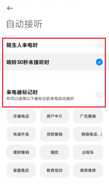 自动接听的设置情景有很多,比如选择【响铃30秒未接听时】,手机即会自动接听,