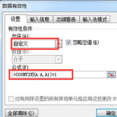2.在弹出窗口中有效性-允许功能框中选择“自定义”,接着在下面公示栏中输入命令:=COUNTIF(A:A,A1)=1,其中括号中表示你所框选的部分,等于1说明只能出现一次