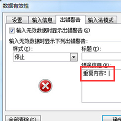 3.在【出错警告】中输入要提示的信息,比如“该内容出现重复”或者“重复内容”