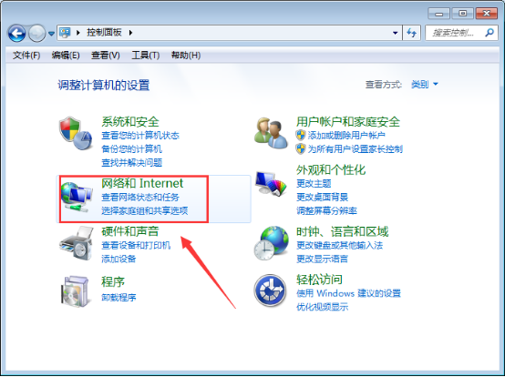 2、弹出控制面板窗口,点击【网络和Internet】。