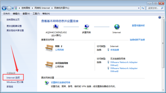 4、这样就进入到“网络和共享中心”界面,然后点击左下方的【Internet 选项】。