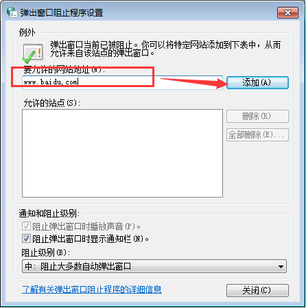 6、进入“弹出窗口阻止程序设置”窗口,如果需要设置允许弹窗的特定网页,只需在“要允许的网站地址”一栏之下的文本框中输入特定网址,比如百度的网址,然后点击右侧【添加】,即可将该网址设定为不被禁止的网页。