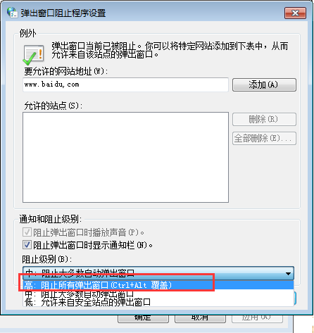7、另外窗口中阻止级别的设置,也会直接影响到阻止程序的级别,比如我们一般将阻止级别设置为“中:阻止大多数自动弹出窗口”,如果用户对弹窗深恶痛疾的话,可以将该级别设置为“高:阻止所有弹出窗口”。设置完成之后点击窗