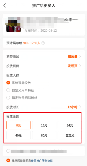 如图,进行相关设置,选择投放时长、投放金额,上方会标注预计展示人数,确认之后,点击支付,即可完成推广。