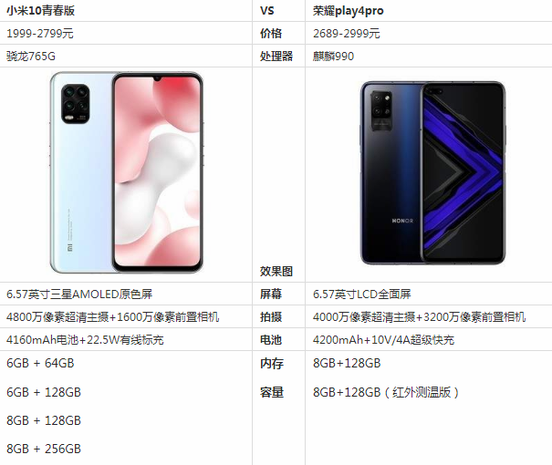 一、小米10青春版和荣耀play4pro主要参数对比