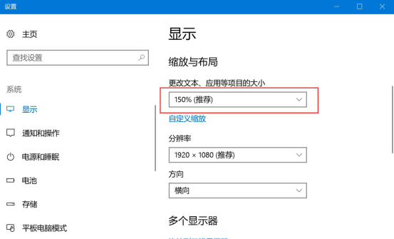 2.然后,进入电脑的显示设置页面,可以看到它的分辨率是1920*1080,显示的缩放比例是150%。就是因为显示的缩放比例过大,才导致了用户点击头榜直播盒子直播特效的时候,它总是出现闪退的情况。