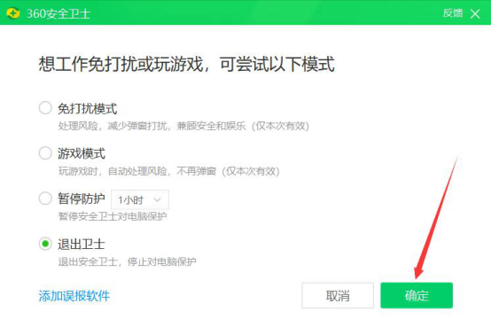 6.最后,它便会弹出如下图的窗口提示,点选“退出卫士”,点击“确定”按钮,即可退出360安全卫士,再重启头榜直播盒子,会发现点击直播特效时不再闪退了。