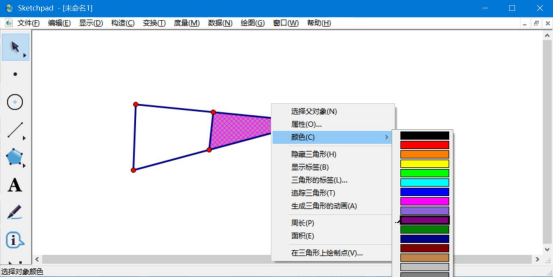 3.当然了,如果不喜欢几何画板默认的重叠部分阴影颜色,就可以将鼠标右键单击阴影部分,并在右键菜单中,点击“颜色”,并从颜色列表中选择自己想要的颜色来应用即可。