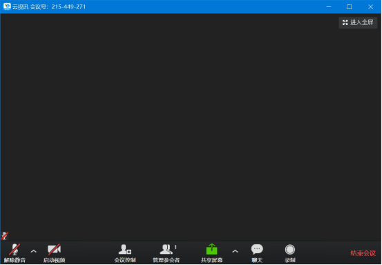 4.此时,进入云视讯电脑版的会议室。我们可以通过“会议控制”来一键邀请参会者,通过“管理参会者”设置全体静音;通过“共享屏幕”来我来教你屏幕内容等等;通过“聊天”发送信息;也可以通过“录制”来录制会议内容;而点击“结束会议”便可结束会议。