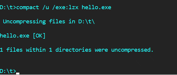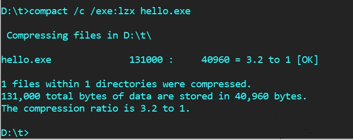 接下来在cmd中切换到d:\\t目录下,执行以下命令【compact /c /exe:lzx hello.exe】,注意空格符,点按回车,